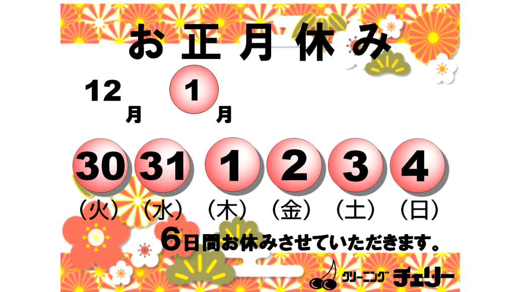 2025年12月4日 / 最終更新日時 : 2025年12月4日 cherry 未分類 お正月休み6日間 12月は水曜日と 12月30日~ 1月4日までの6日間お正月休みをさせて頂きます。ご迷惑をかけいたしますが、よろしくお願いいたします。 Tweet