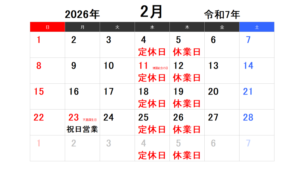 2026年2月2日 / 最終更新日時 : 2026年2月2日 cherry お知らせ 2月カレンダー 令和8年1月14日~3月19日までの間 水曜日と木曜日を連休させて頂きます。 23日は祝日時間で営業致します。 大変ご迷惑をお掛け致しますがよろしくお願いいたします。 Tweet