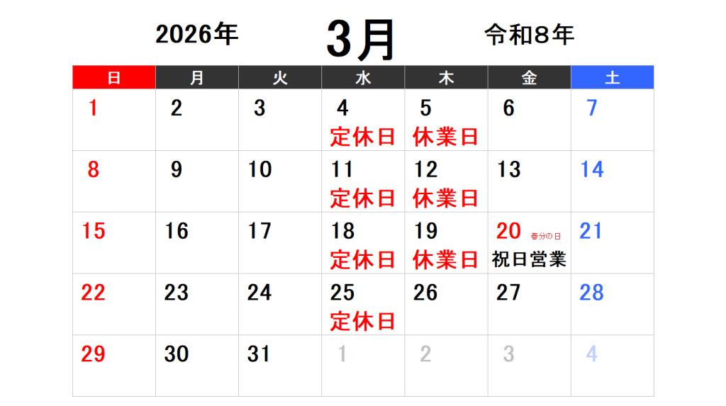 2026年2月27日 / 最終更新日時 : 2026年2月27日 cherry お知らせ 3月カレンダー 令和8年1月14日~3月19日までの間 水曜日と木曜日を連休させて頂きます。 20日は祝日時間で営業致します。 大変ご迷惑をお掛け致しますがよろしくお願いいたします。 Tweet